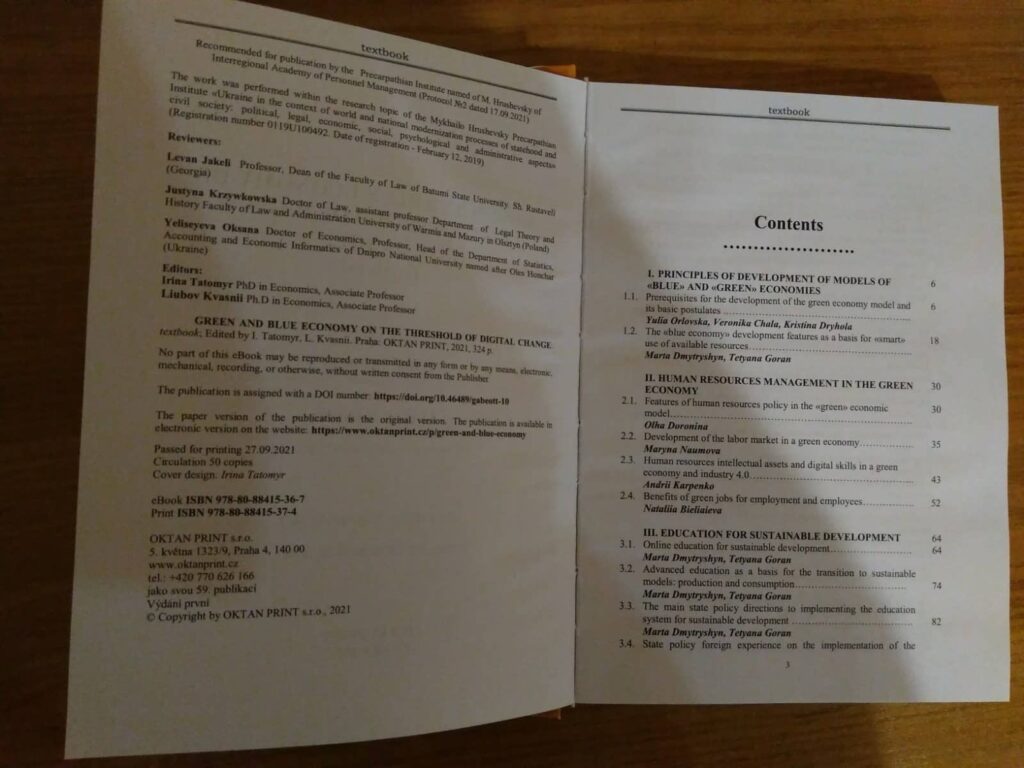 Директор КУ «Центр професійного розвитку педагогічних працівників» Ірина Татомир впродовж червня – жовтня 2021 року стала координатором міжнародного наукового проєкту. У рамках державної тематики (Registration number 0119U100492) у чеському видавництві OKTAN PRINT вийшов друком міждисциплінарний підручник «GREEN AND BLUE ECONOMY ON THE THRESHOLD OF DIGITAL CHANGE», який буде корисним для здобувачів та педагогічних працівників, що займаються питаннями екології й енергозбереження. Підручник охопив ряд тем, які стосуються засад розвитку моделей «синьої» та «зеленої» економік, закордонних практик створення «зелених» робочих місць, формування нової моделі системи освіти в інтересах сталого розвитку, «зелених» та «синіх» сценаріїв цифровізації енергетичного сектору, перспектив розвитку «зеленого» і «синього» бізнесу тощо. До складу авторського колективу увійшли провідні науковці не лише з різних міст України (Києва, Запоріжжя, Харкова, Херсону, Львова, Івано-Франківська, Вінниці), а й Польщі та Великобританії. Видання прорецензували: Леван Якелі (Levan Jakeli) – професор, декан юридичного факультету Батумського державного університету Ш. Руставелі (Грузія), Юстина Кживковська (Justyna Krzywkowska) – доктор економічних факультету права та адміністрації Вармінсько–Мазурського університету в Ольштині (Польща). Нагадаємо, що це третій проєкт, який виходить під науковою редакцією Ірини Татомир. Попередні видання «Artificial intelligence as a basis for the development of the digital economy» та «The economics of postpandemics: prospects and challenges» уже були успішно апробовані у закладах освіти України.