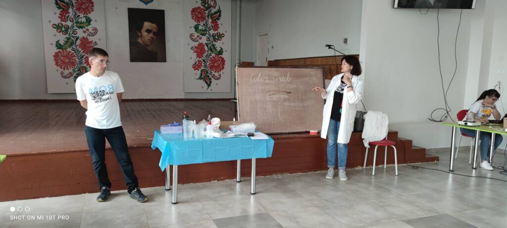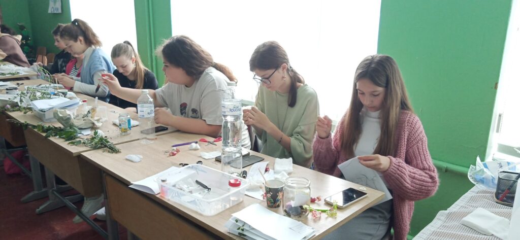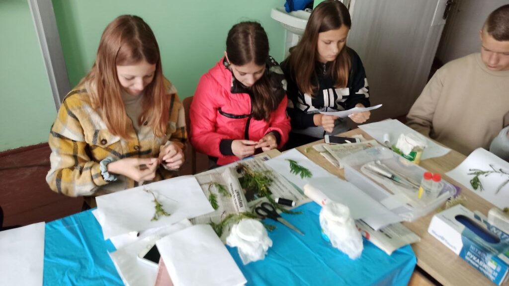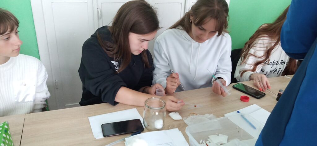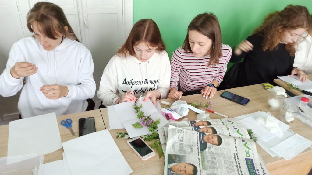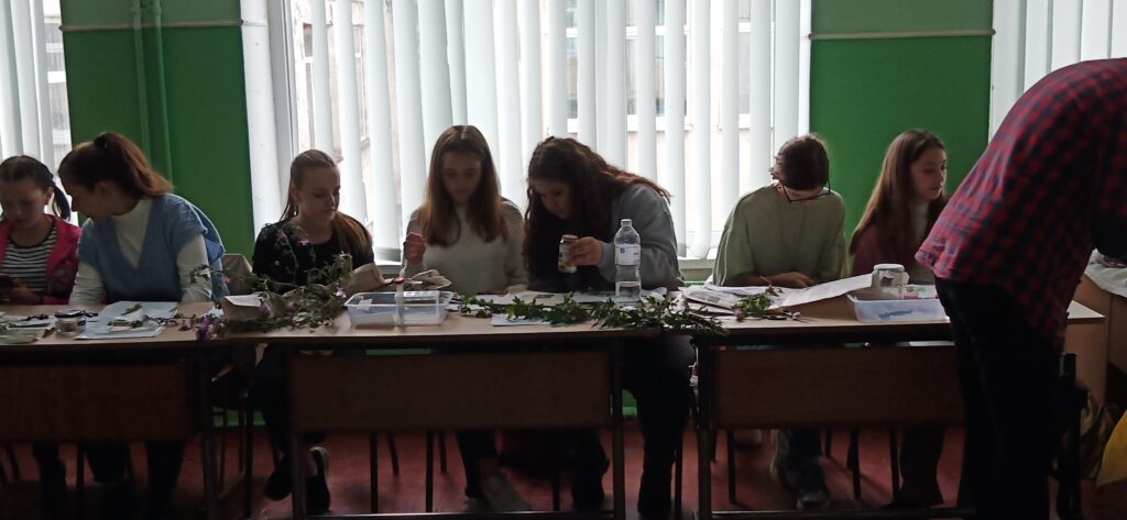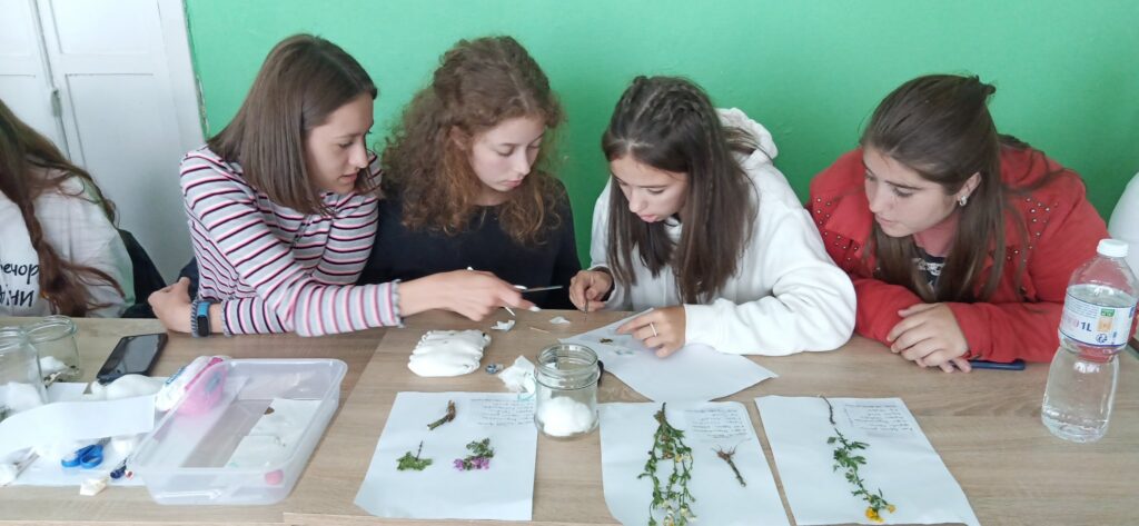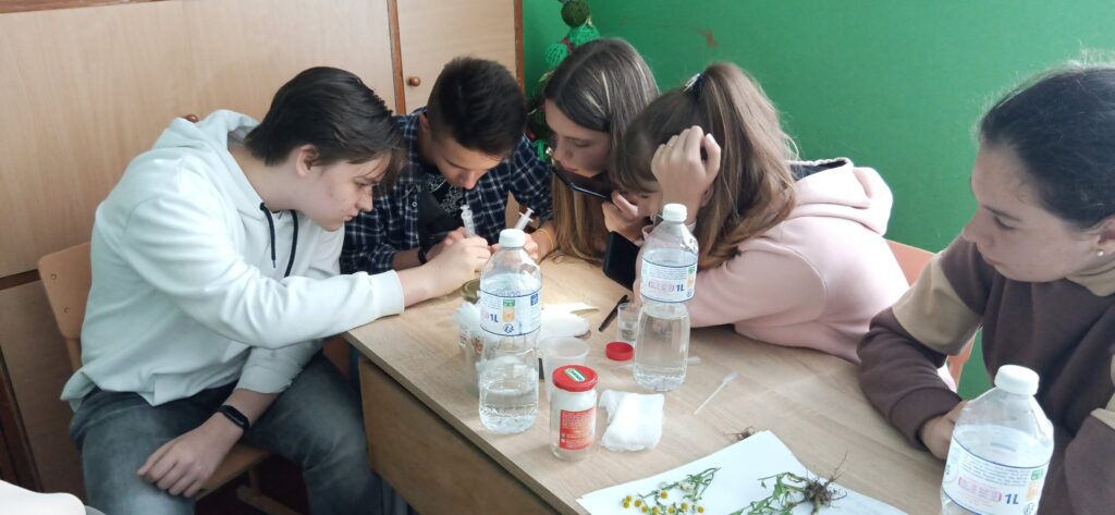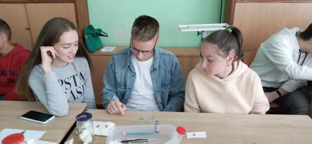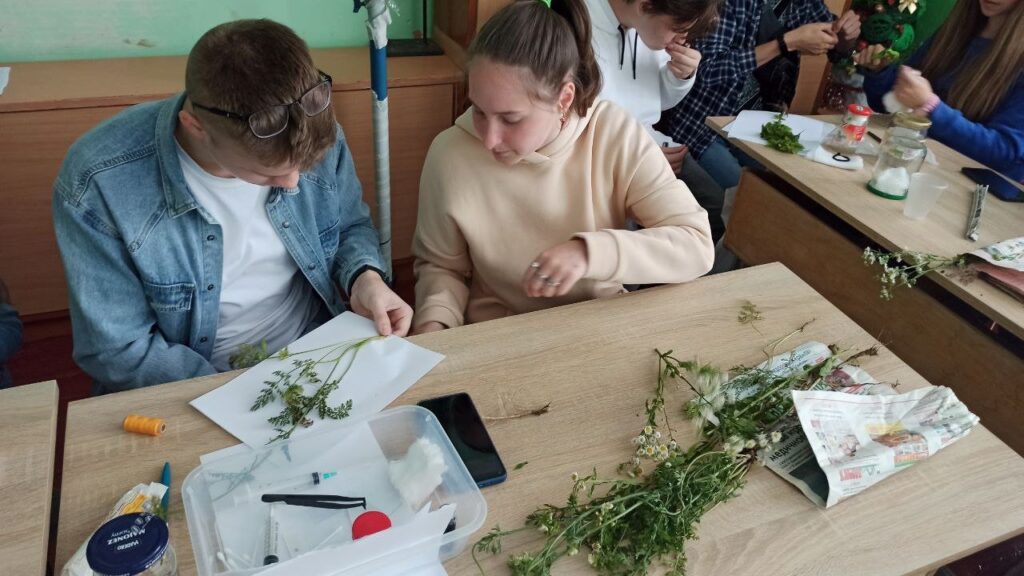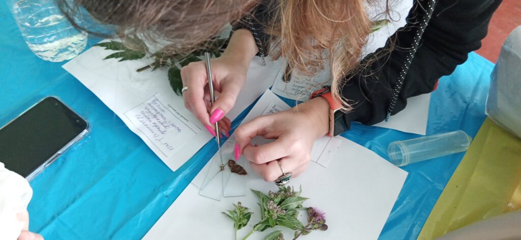 Продовжили свої дослідження і учні-біологи. У супроводі Інни Горюнової пізнавальною стала для них польова екскурсія зі збору ботанічних зразків квітів рослин, плодів листків та зоологічних зразків комах, які використали для проведення мікроскопічних досліджень. Юні дослідники навчилися виготовляти гербарні зразки та матрасики з комахами для подальшої їх систематизації, а також тимчасові давлені мікропрепарати для дослідження мешканців водойм.