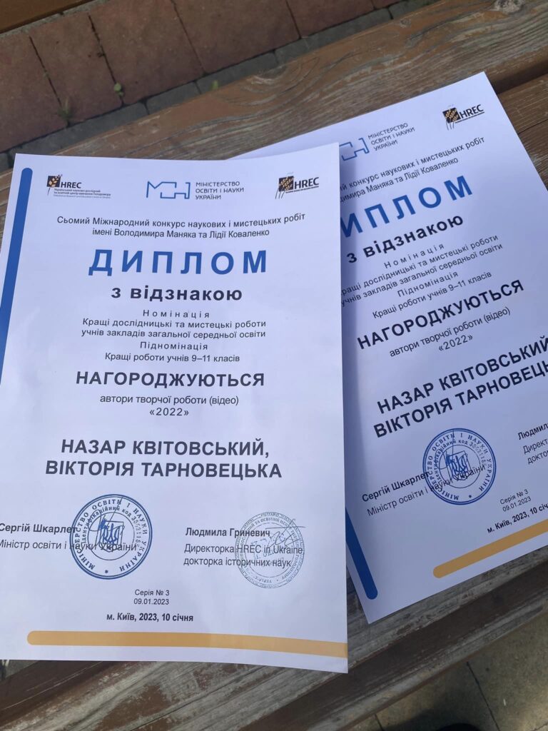 Вихованці закладу освіти Назар Квітковський та Вікторія Тарновецька створили інтерв’ю з індивідуальних історій, а також порівняли епоху Голодомору і сучасної російсько-української війни. Продемонстрували ґрунтовні знання та у неформальному підході надали відповіді на питання: Чому і як ми зберігаємо пам’ять про Голодомор? Чи вважають Голодомор першопричиною війни зараз? Як наші знання і пам’ять про Голодомор допомагають нам краще зрозуміти природу сучасної російсько-української війни, роблять нас сильнішими у нашій боротьбі і наближають нашу Перемогу.