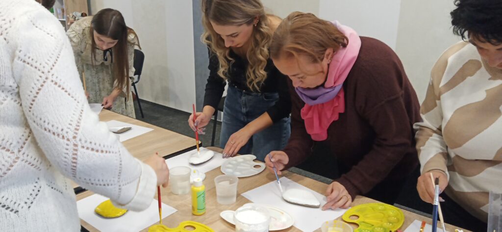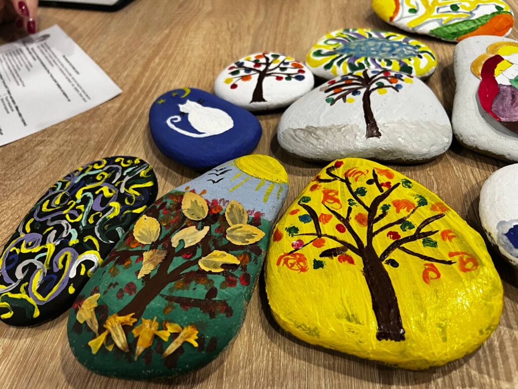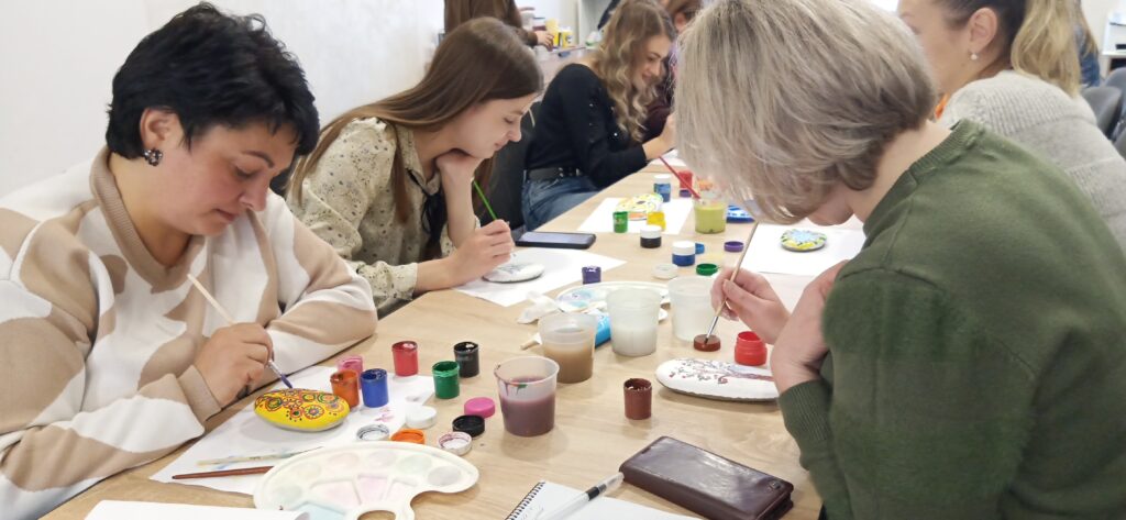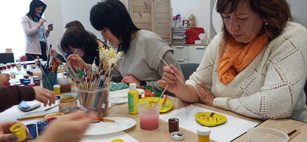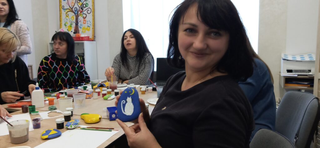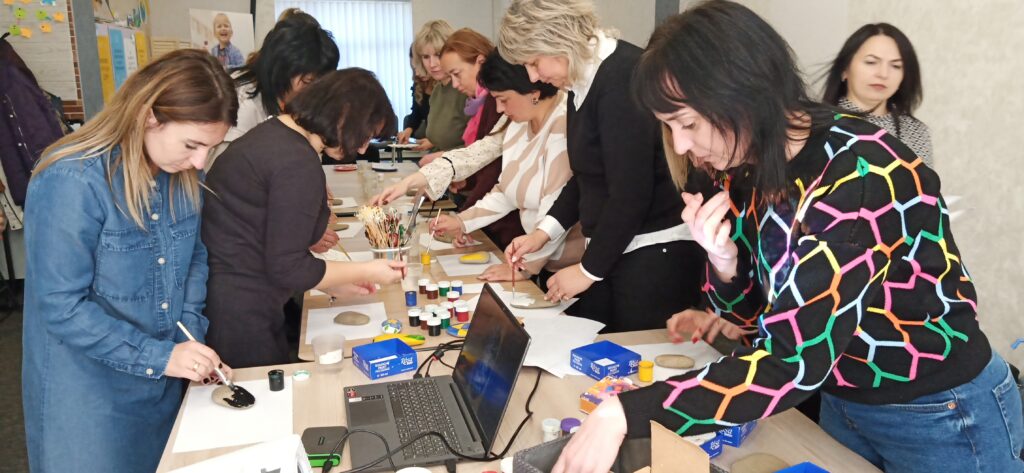 Педагоги вчилися працювати з різними видами арттерапії, техніками серійного малювання, які використовуватимуть в професійній діяльності при роботі з учнями для пошуку їх власних ресурсів та проживання негативних емоцій, переживань, страхів через образи. Взяли участь у майстер-класі «малюнок на камені», який допомагає розвивати фантазію, дрібну моторику рук і тактильні відчуття.