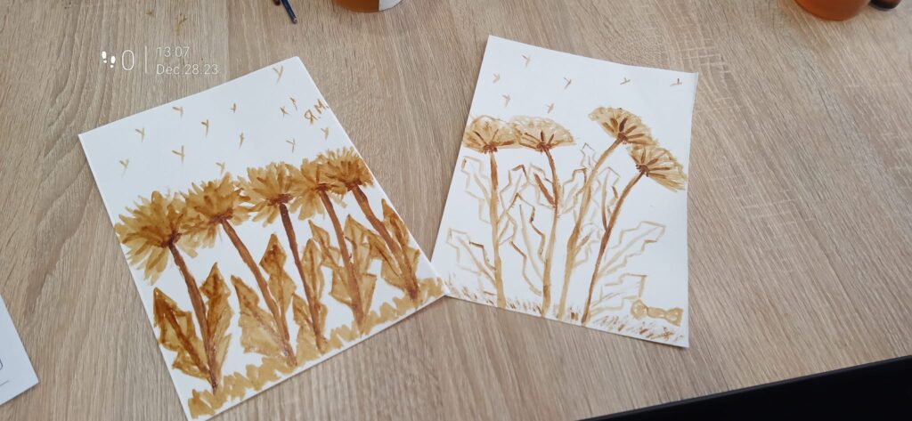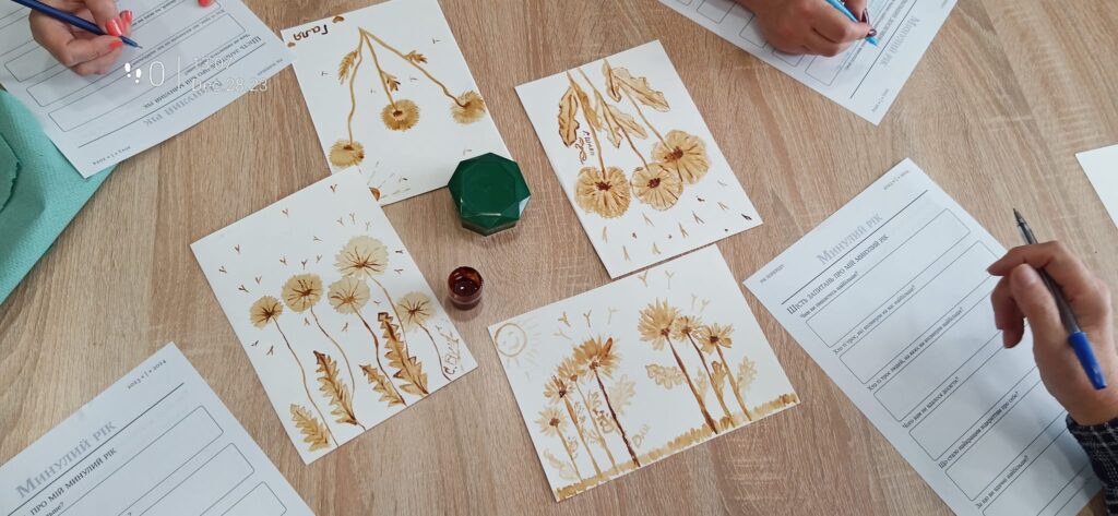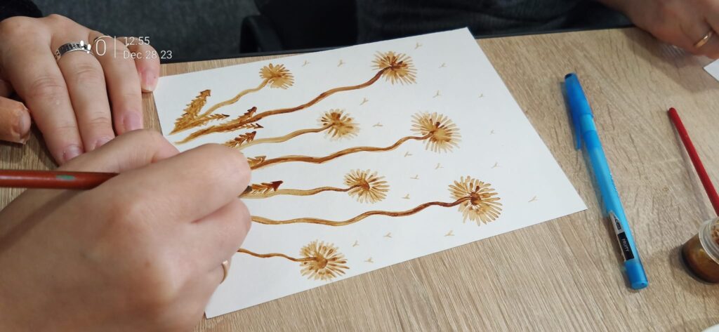 За допомогою міцної кави з додаванням гвоздики та кориці кожен зміг створити дивовижну монохромну картину. Така арт-терапевтична техніка допомагає при роботі із дітьми, дозволяє їм пережити тривогу, страхи та внутрішні конфлікти. Зцілює сам процес, а не його результат. Виконали ряд вправ на розвиток саморефлексії, самоаналізу та емпатії.