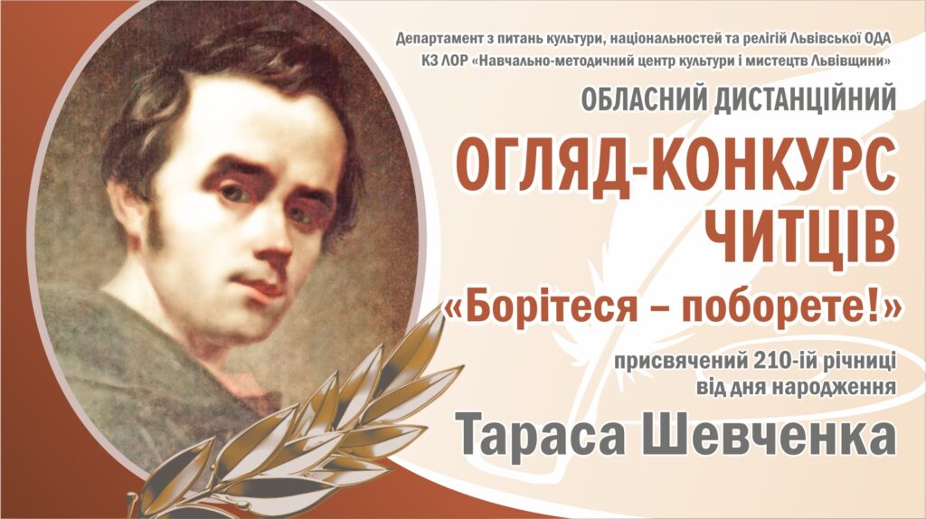 Обласний комунальний «Навчально-методичний центр культури і мистецтв Львівщини» запрошує на дистанційний огляд-конкурс читців «Борітеся – поборете!». Захід відбудеться у березні 2024 року і присвячений 210-й річниці від дня народження Тараса Шевченка.