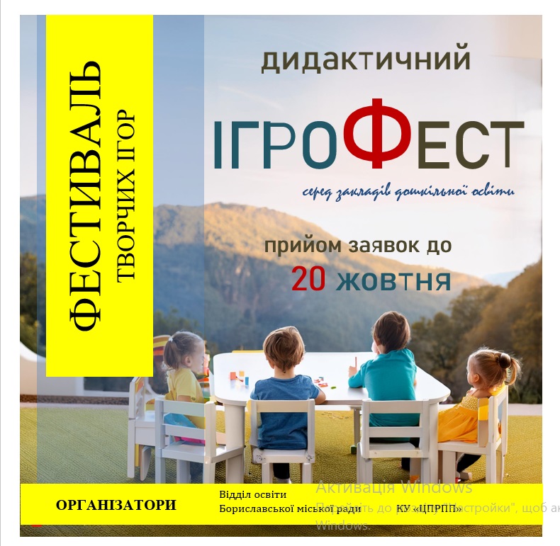 Відділ освіти та КУ «Центр професійного розвитку педагогічних працівників» анонсують про проведення 31 жовтня 2024 року серед закладів дошкільної освіти фестивалю творчих ігор «Дидактичний ІгроФест».