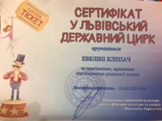 За підсумками роботи експертного журі у фестивалі Різдвяних шопок перемогу здобула вихованка еколого-натуралістичного напряму Центру дитячої та юнацької творчості Евеліна КЛЕПАЧ. Юна лауреатка отримала подяку міського голови за збереження та примноження різдвяних традицій, а також отримала сертифікат у Львівський державний цирк.