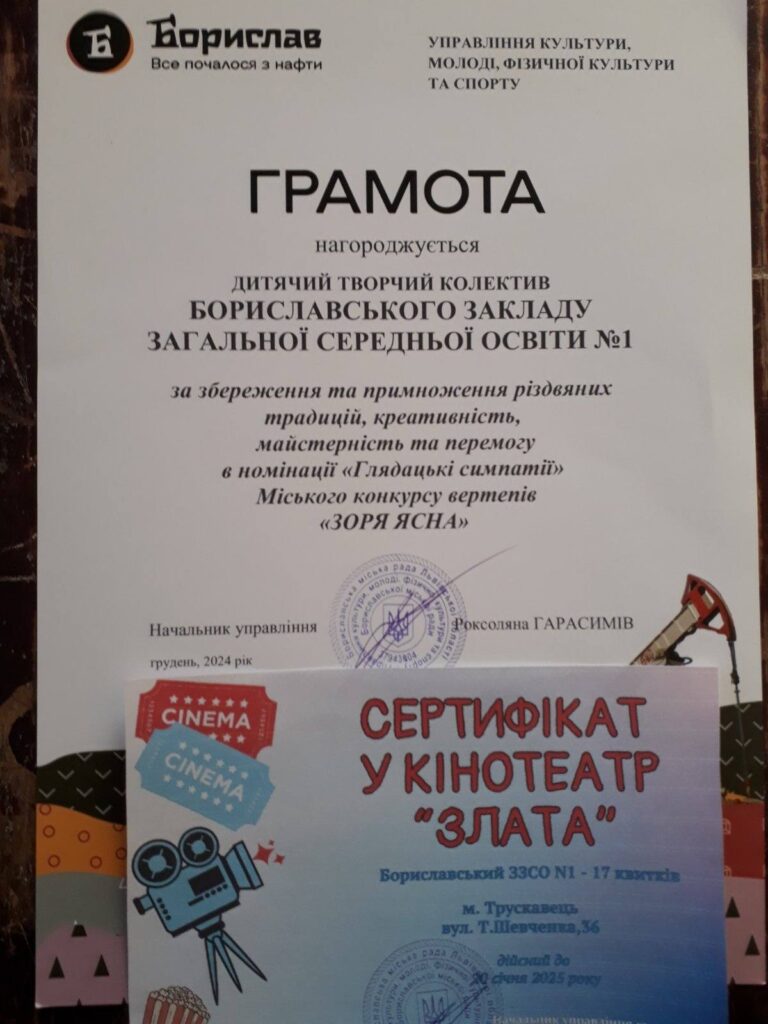 У фестивалі-конкурсі вертепів «Зоря ясна» перемогу в номінації «Глядацькі симпатії» одержав педагогічний колектив Бориславського закладу загальної середньої освіти І-ІІІ ступенів №1. Педагоги були нагороджені грамотою, солодощами і сертиікатом у кінотеатр «Злата».