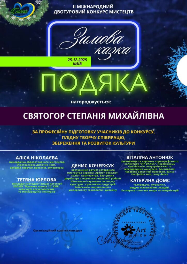 За результатами ІІ Міжнародного двотурового конкурсу мистецтв «Зимова казка» (м. Київ), вихованка студії — талановита та наполеглива Анастасія Чабан — виборола почесне звання лауреата та здобула Диплом ІІ ступеня. Педагог-наставник – керівник гуртка Степанія Святогор.