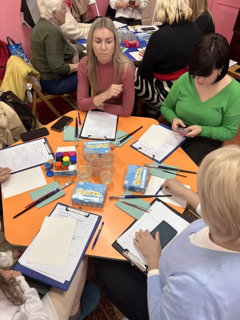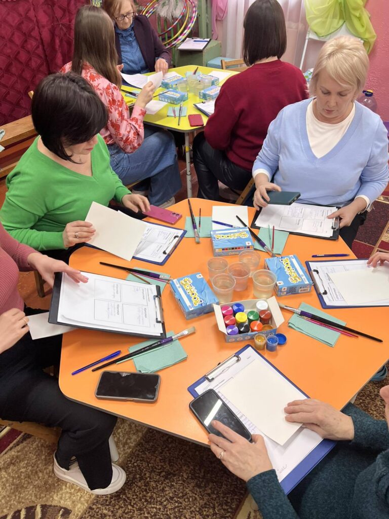 Разом із тренерами наші вихователі опановували техніки, які допомагають дітям долати стрес, вивільняти напругу без агресії та повертати відчуття безпеки через гру. Для того, щоб краще розуміти вихованців, відпрацювали низку вправ шляхом використання підручних матеріалів на стабілізацію психоемоційного стану та опанували ряд арт терапевтичних технік.